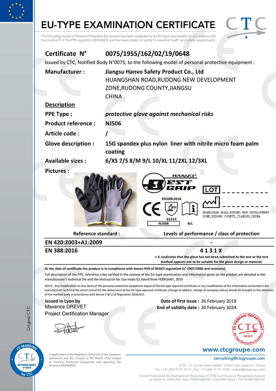 每一款水洗超细发泡手套均通过7遍水洗,手感细腻舒适且无异味和DMF等有害物质残留。产品通过欧盟CE检测认证,且符合国际纺织品协会OEKO-TEX standard100测试要求。